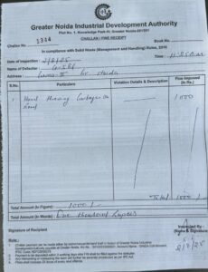 कूड़ा उठाने के लिए प्राधिकरण की टीम नियमित रूप से घर-घर पहुंच रही है। काफी लोग ऐसे हैं जो सोते रहते हैं, बाद में पॉलीथिन में कूड़ा भरकर इधर-उधर फेंक देते हैं। शनिवार को अभियान चलाकर ग्रेटर नोएडा प्राधिकरण की टीम ने कूड़ा फेंकने वालों का वीडियो बनाया और हजारों रुपए का जुर्माना भी लगाया है। देखने में आया कि कूड़ा फैलाने वालों में शिक्षित लोग भी शामिल हैं। अभियान के तहत प्राधिकरण ने सेक्‍टर गामा-2 जी ब्‍लाक-586, बीटा वन ई ब्‍लाक-102, बीटा वन ए ब्‍लाक- 50, बीटा वन ए ब्‍लाक-247 सहित अन्‍य लोगों पर एक-एक हजार रुपए का जुर्माना लगाया है।