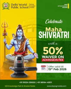 द न्यूज गली, ग्रेटर नोएडा: नॉलेज पार्क तीन स्थित दिल्ली वर्ल्ड पब्लिक स्कूल के द्वारा शिक्षा का उजियारा घर-घर पहुंचाने के लिए लगातार सराहनीय कार्य किया जा रहा है। इसमें एक कदम और आगे बढ़ाते हुए स्कूल प्रबंधन ने बड़ा निर्णय लिया है। जिसके तहत शिवरात्रि के महापर्व पर स्कूल में प्रवेश लेने वाले सभी छात्रों को फीस में 50 प्रतिशत की छूट दी जाएगी। दिल्ली वर्ल्ड पब्लिक स्कूल की निदेशिका कंचन कुमारी ने बताया कि भगवान शिव को ‘आदि योगी’ कहा जाता है, जो हमें जीवन में संतुलन, साधना और समर्पण का मार्ग दिखाते हैं। उनका स्वरूप हमें सिखाता है कि त्याग, तप और सरलता के माध्यम से ही सच्ची सफलता प्राप्त की जा सकती है। महाशिवरात्रि का उपवास, ध्यान और रात्रि जागरण हमें आत्मनियंत्रण और अनुशासन का महत्व समझाता है। इसे ध्यान में रखते हुए शिक्षा को समाज के हर वर्ग तक पहुँचाने के उद्देश्य से दिल्ली वर्ल्ड पब्लिक स्कूल द्वारा महाशिवरात्रि के पावन अवसर पर नए प्रवेश लेने वाले विद्यार्थियों के लिए प्रवेश शुल्क में 50 प्रतिशत की विशेष छूट देने का निर्णय लिया है। यह पहल उन अभिभावकों के लिए एक सुनहरा अवसर है, जो अपने बच्चों को गुणवत्तापूर्ण और संस्कारयुक्त शिक्षा देना चाहते हैं।